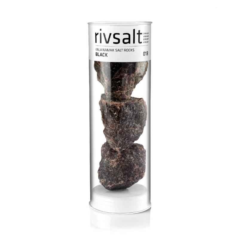 • Embalagem cilíndrica transparente com três blocos de sal preto e rótulo branco com texto