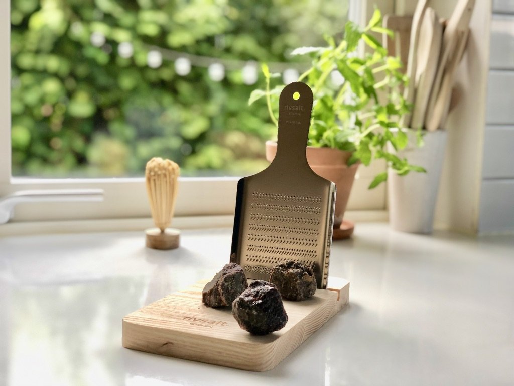 • Tábua de madeira clara com ralador metálico e trufas negras