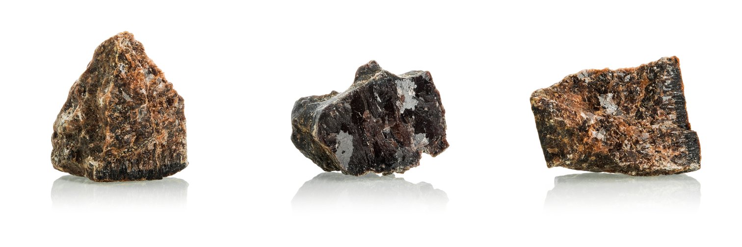 • Três pedras brutas de minerais em fundo branco