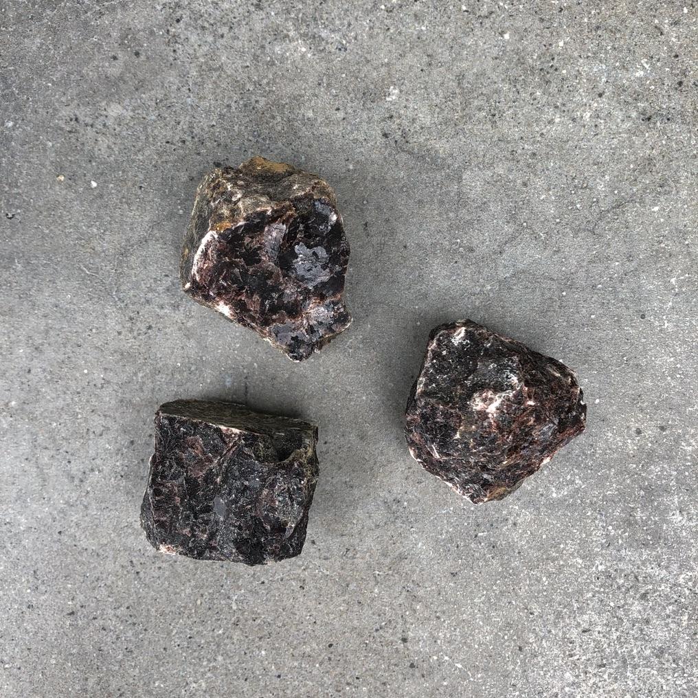 • Três pedras brutas castanhas escuras com manchas claras numa superfície de cimento cinzento