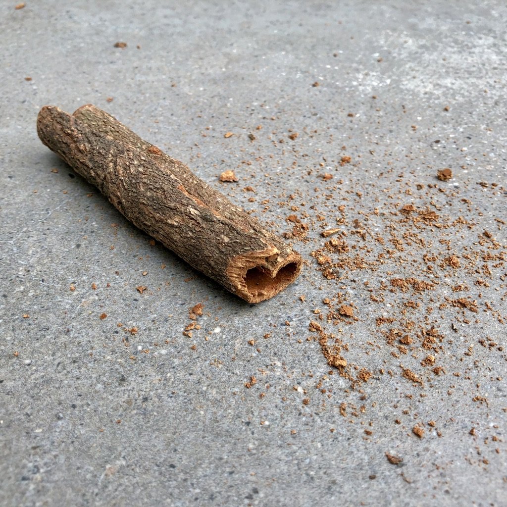• Pau de canela seco sobre chão de cimento com fragmentos à volta
