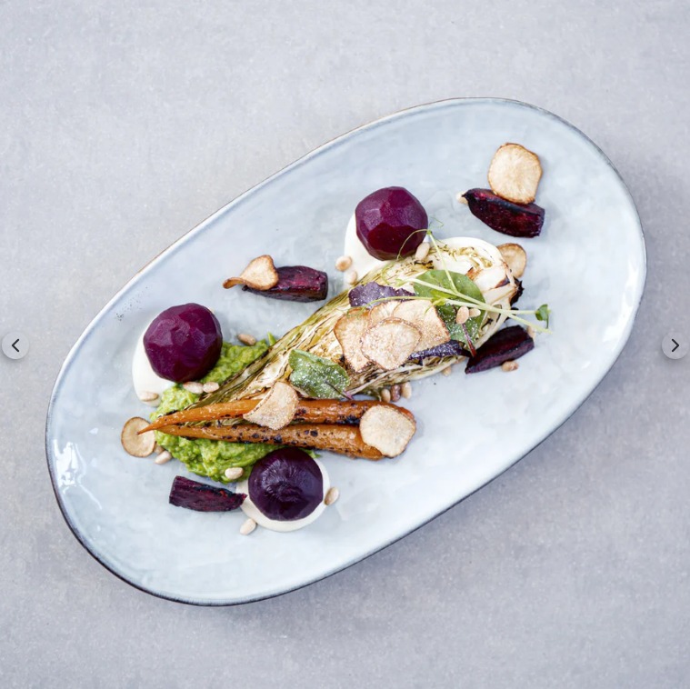 • Prato oval azul com legumes diversos e chips de legumes sobre mesa cinza