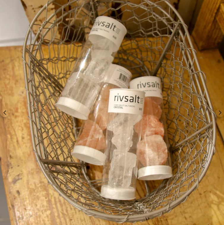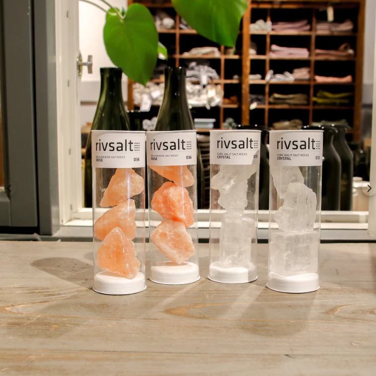 • Recipientes transparentes com cristais de sal rosa e branco etiquetados 'rivsalt' sobre mesa de madeira