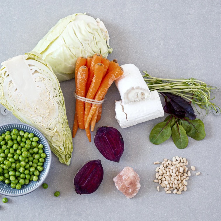• Legumes e ingredientes frescos organizados sobre uma superfície cinzenta
