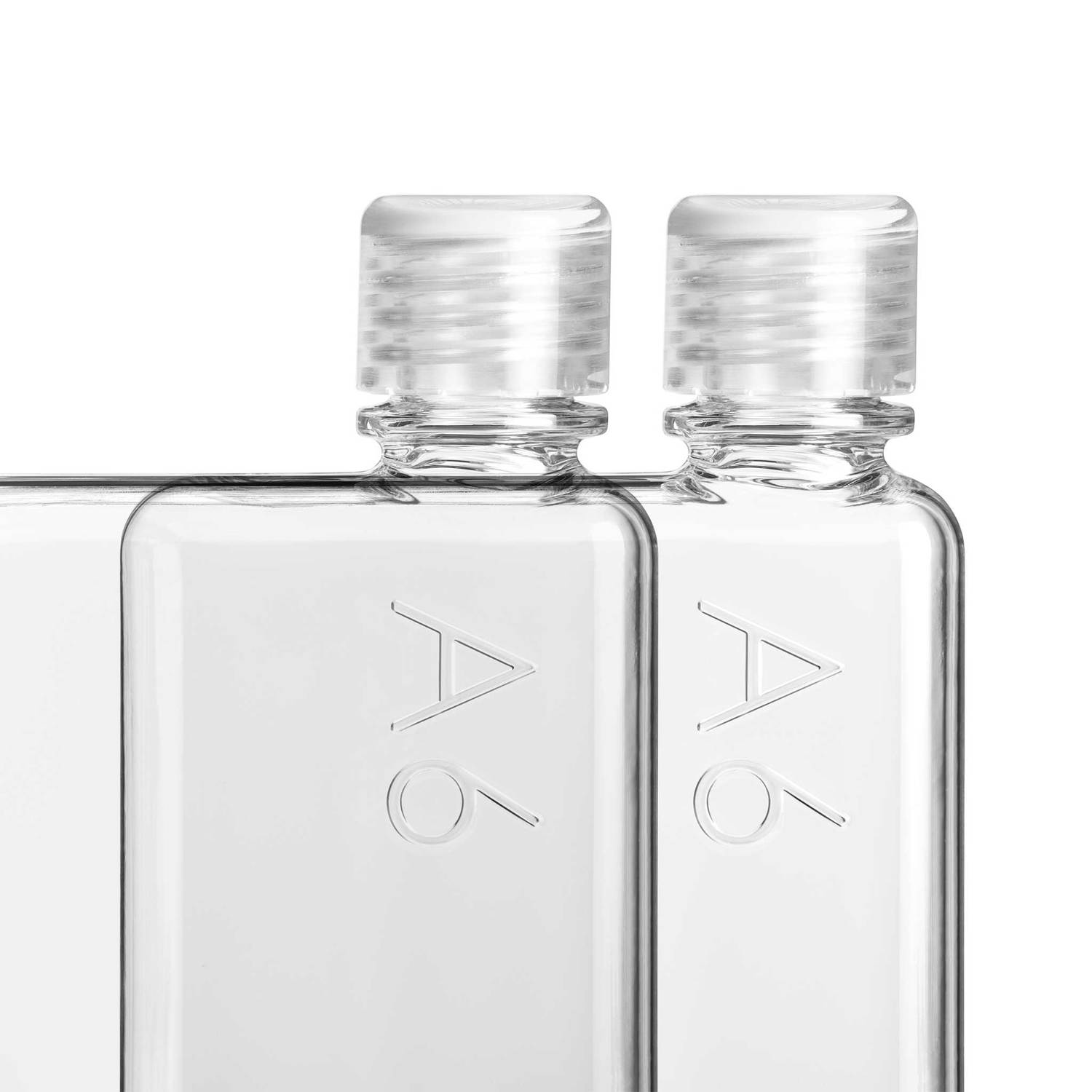 • Garrafas transparentes retangulares com tampa de rosca e gravação A6