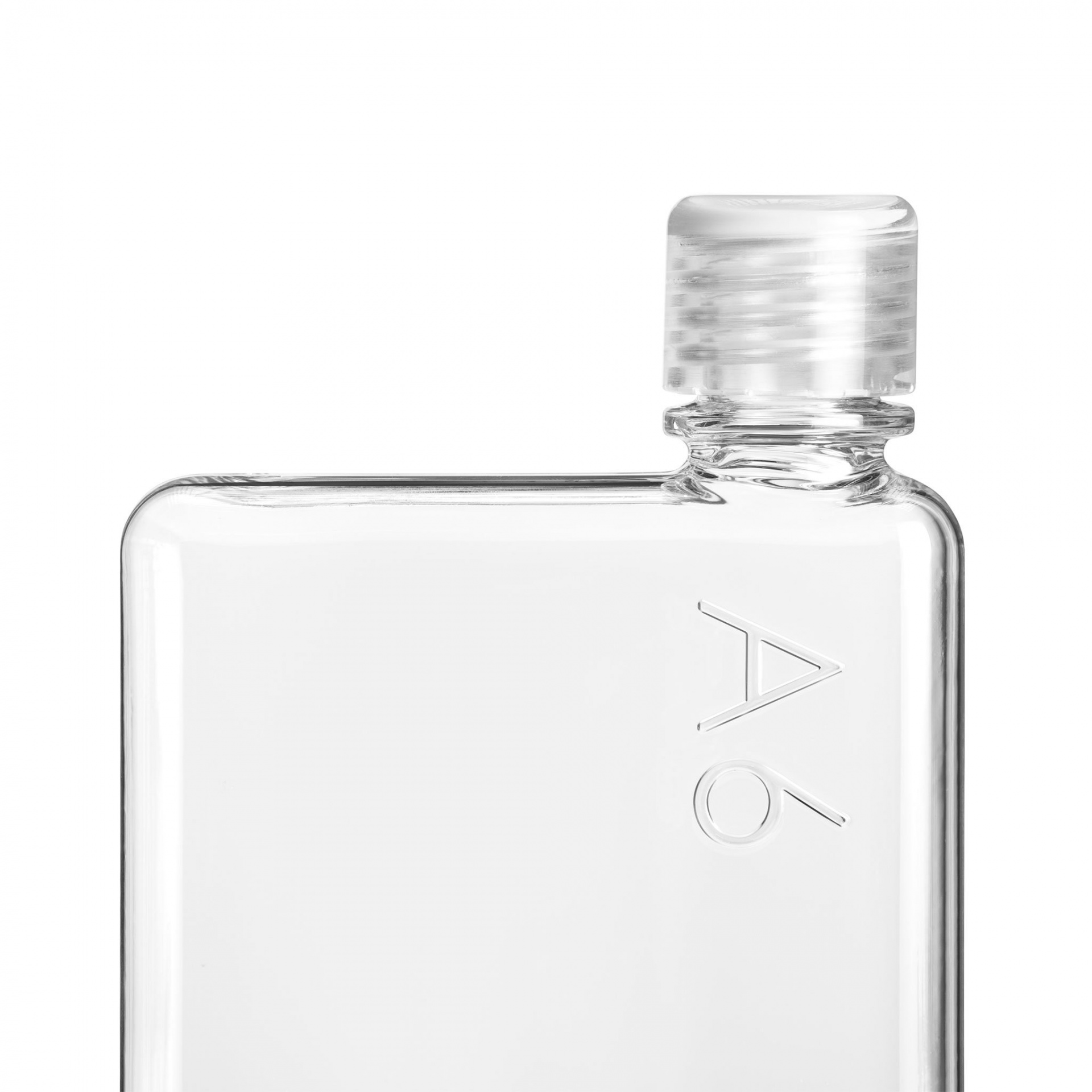 • Frasco de vidro transparente com tampa e texto A6 em relevo