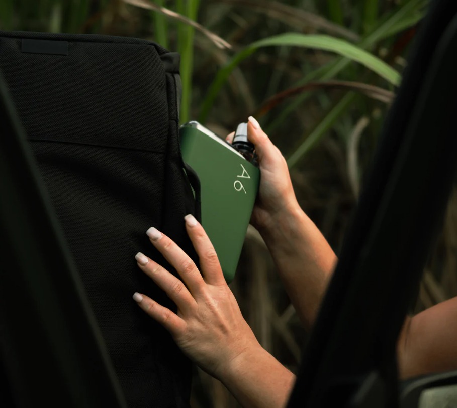 • Garrafa verde A6 a ser guardada numa mochila preta com vegetação ao fundo