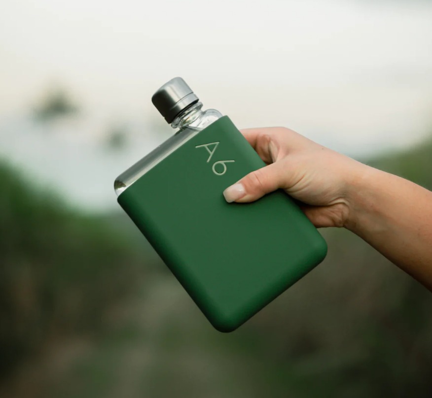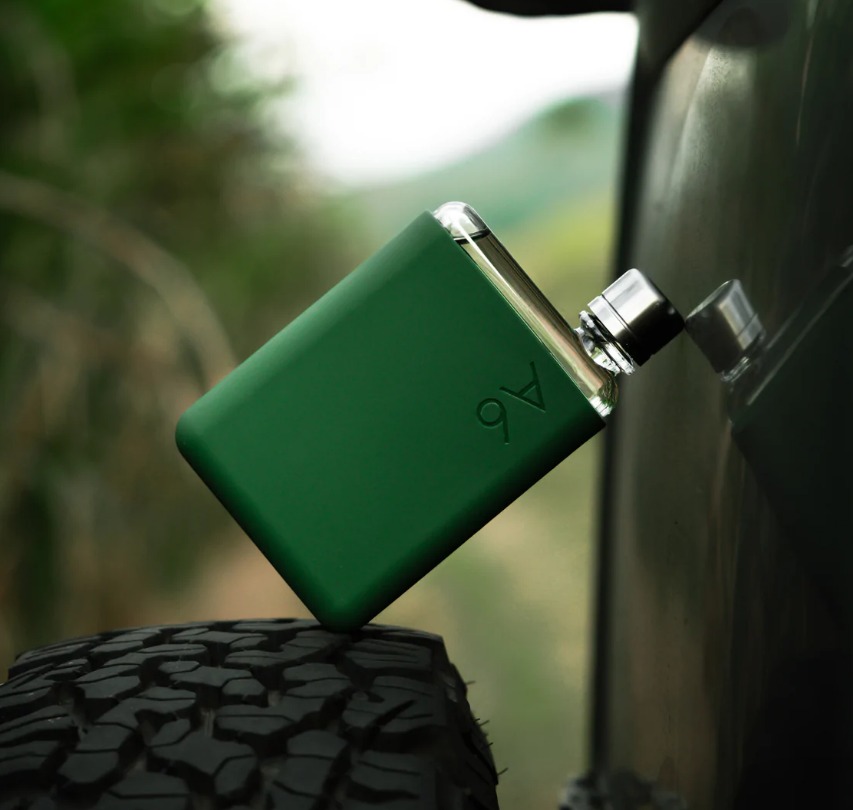 • Frasco de bolso verde com tampa metálica prateada e texto A6
