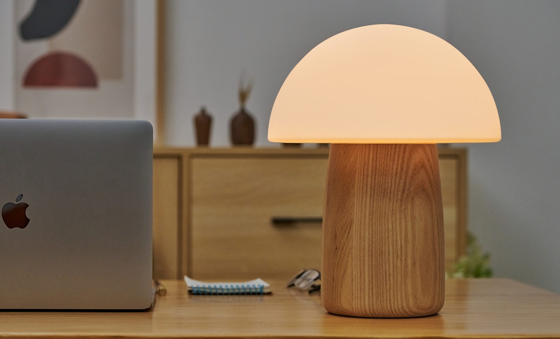 Alice Mushroom Large: Lâmpada em Madeira de Freixo Claro e Vidro Fosco, com 7 Cores RGB e Luz Branca Quente