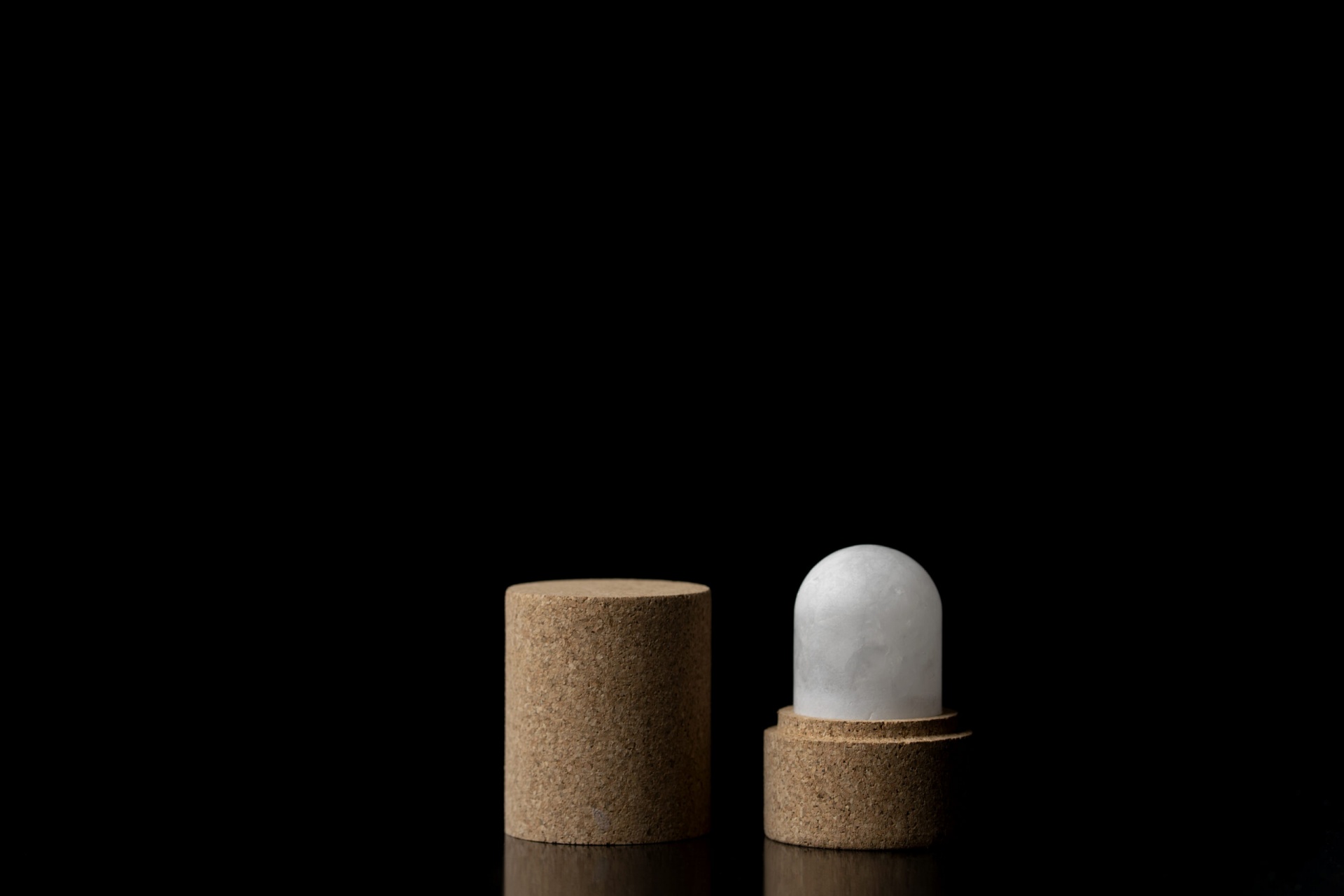 • Desodorizante sólido branco com base e tampa de cortiça sobre fundo preto.