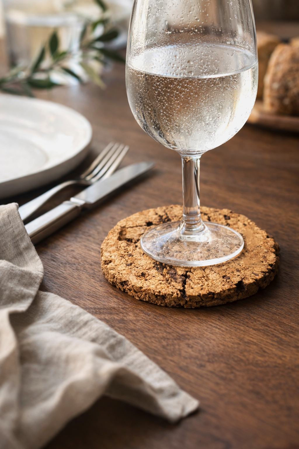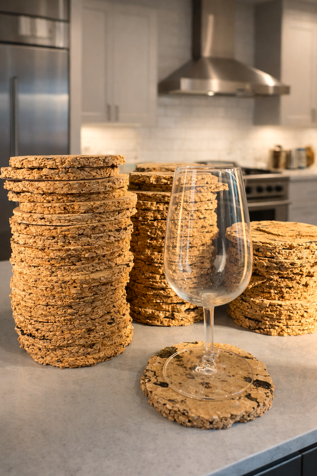 • Bases de cortiça redondas empilhadas num balcão de cozinha com copo de vidro por cima