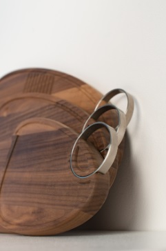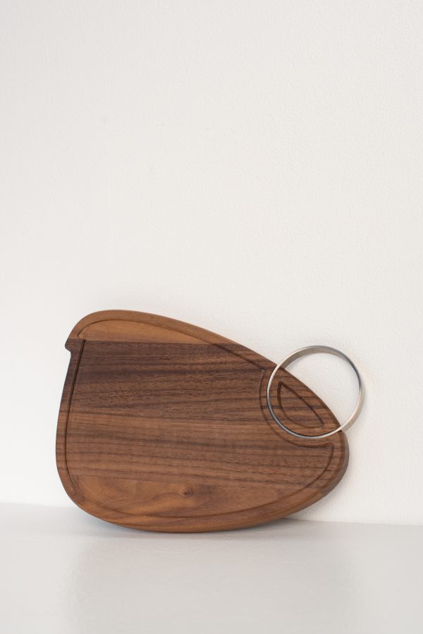 Tabua de corte de madeira escura com aro metálico circular