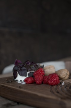 • Framboesas vermelhas, folhas roxas, noz e pimenta preta em tábua de madeira escura