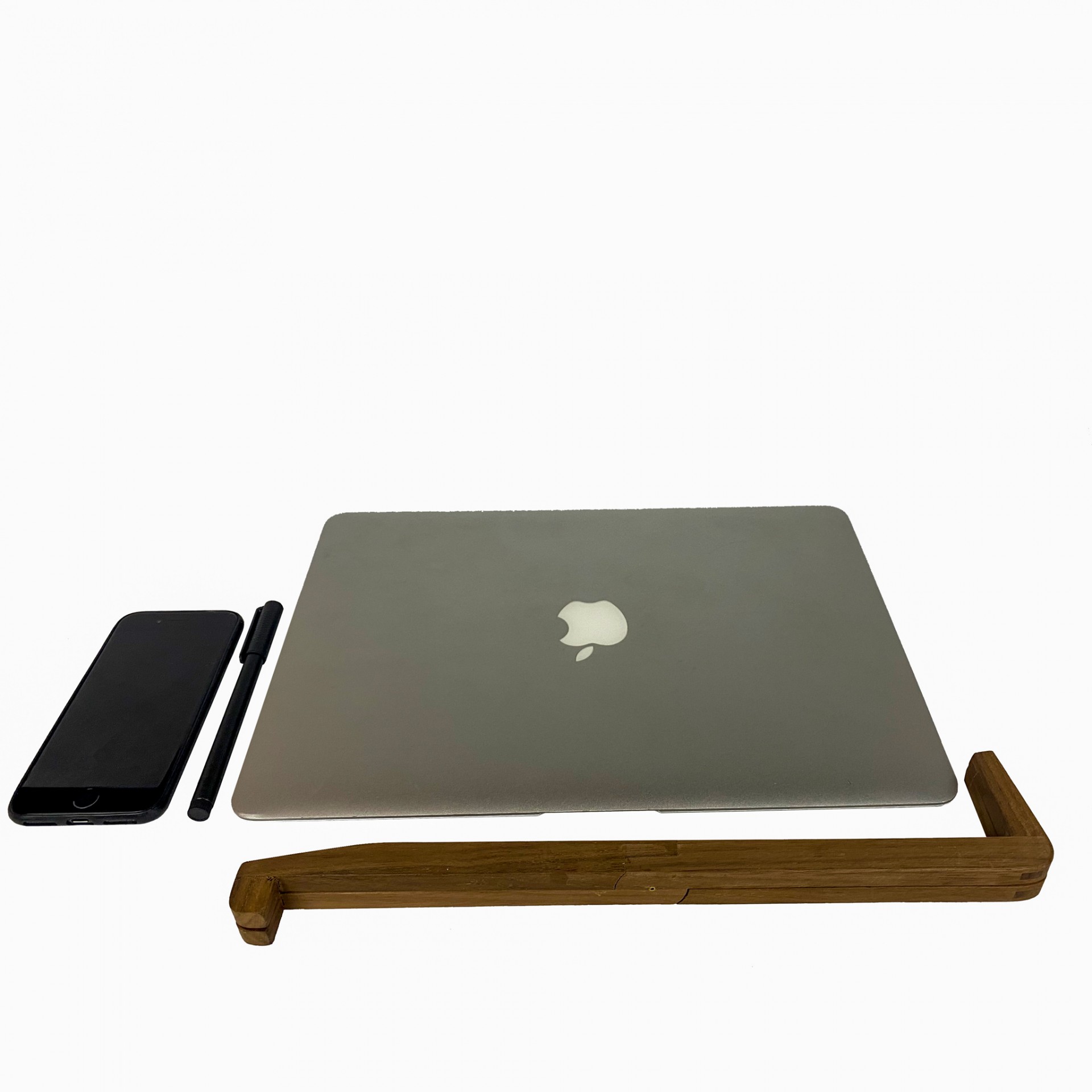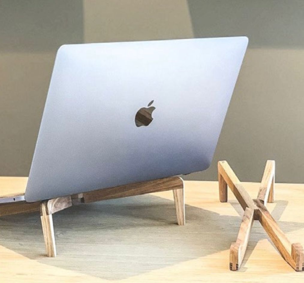 Pernas em madeira, de suporte para portátil com um ângulo confortável para trabalhar. É fácil de guardar – basta dobrar as pernas e colocá-las na sua mochila.