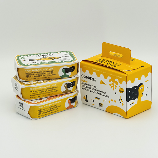 • Três latas de sardinha empilhadas e uma caixa amarela com design e texto em fundo branco