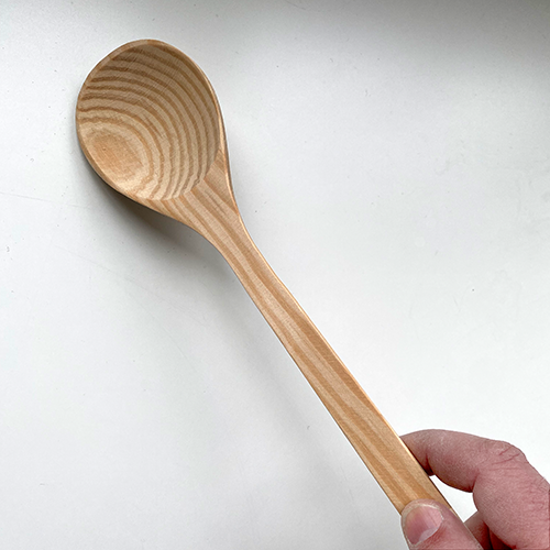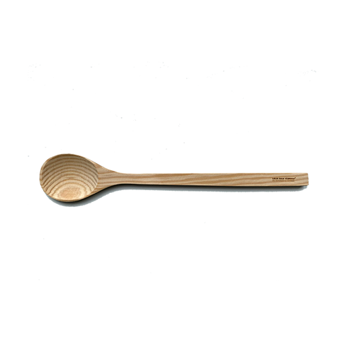 • Colher de madeira clara com cabo comprido e texto preto no cabo
