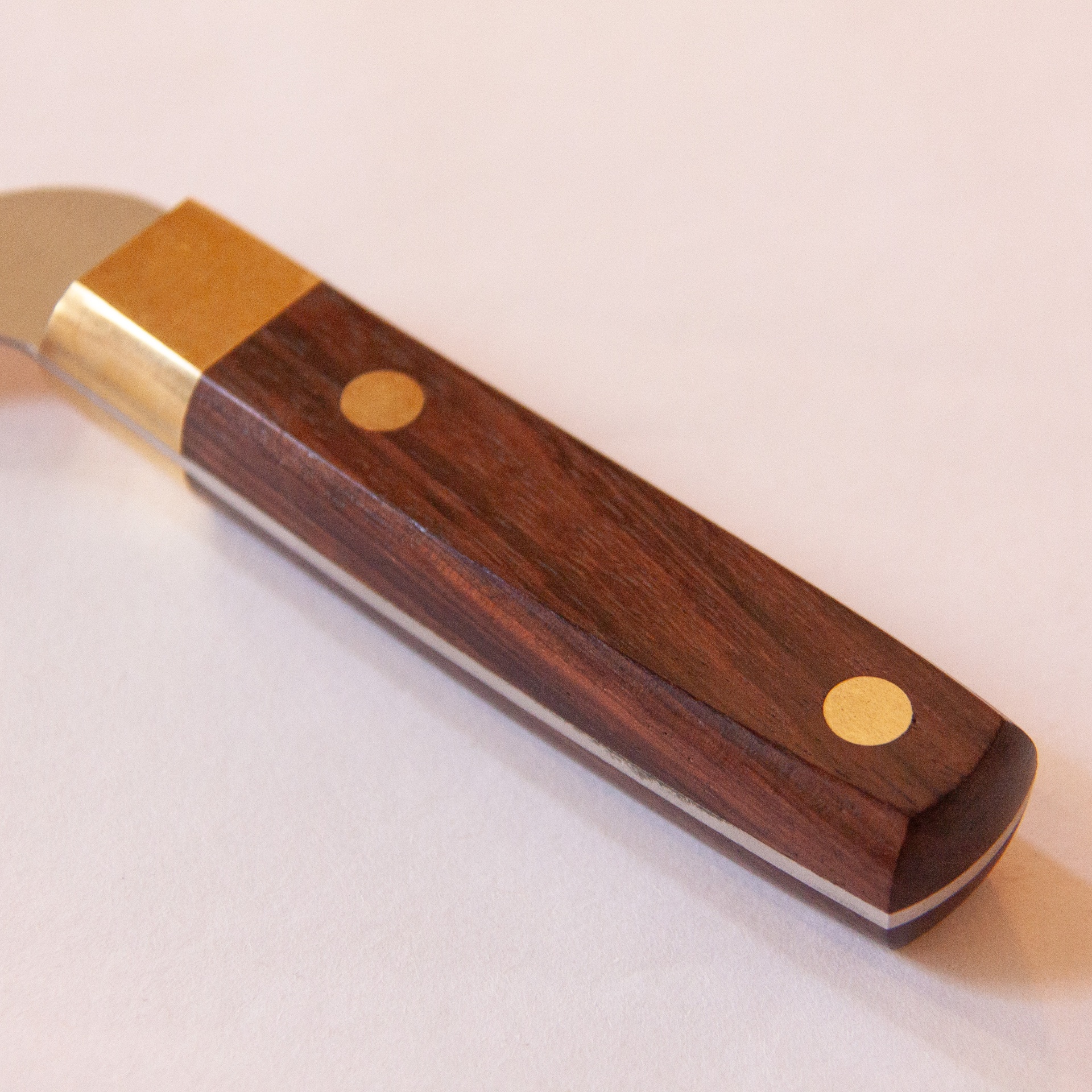 Cabo em madeira de pau-santo com virola e rebites em latão — combinação clássica e intemporal que distingue esta série.
