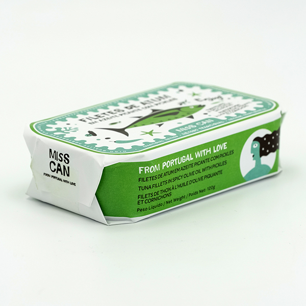 • Lata verde de filetes de atum picante da marca MISS CAN