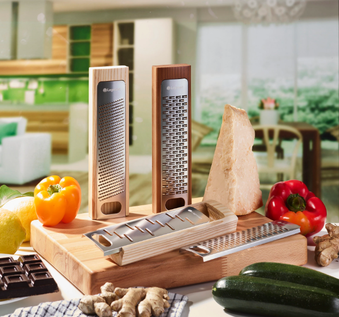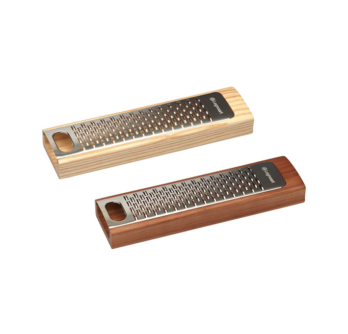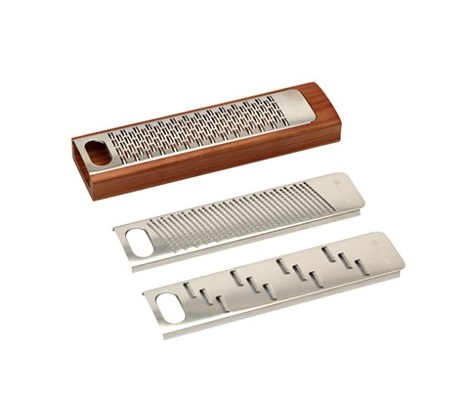Ralador multifuncional, com lâmina de aço inoxidável e corpo de madeira de freixo maciça.