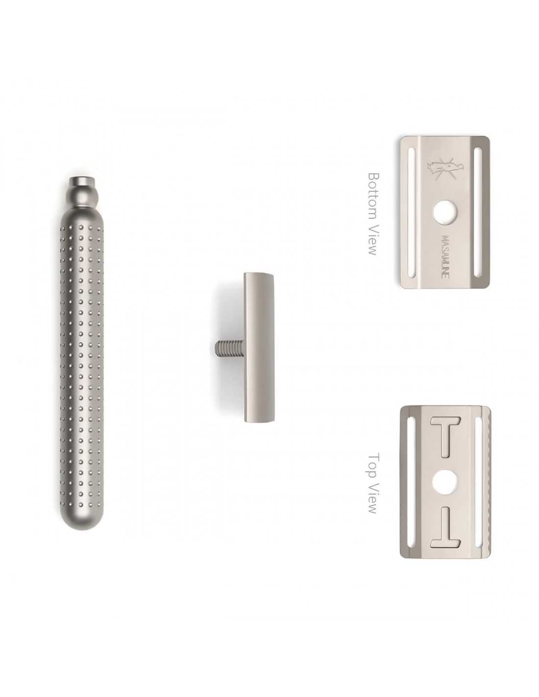 • Peças metálicas prateadas para barbear, mostradas separadas em fundo branco