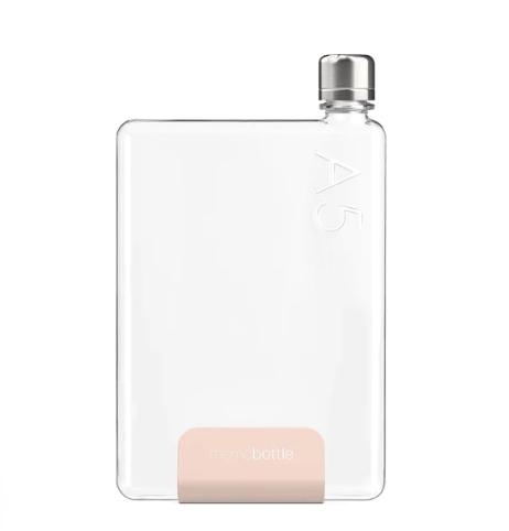 • Garrafa de água transparente retangular com tampa metálica e base rosa memobottle