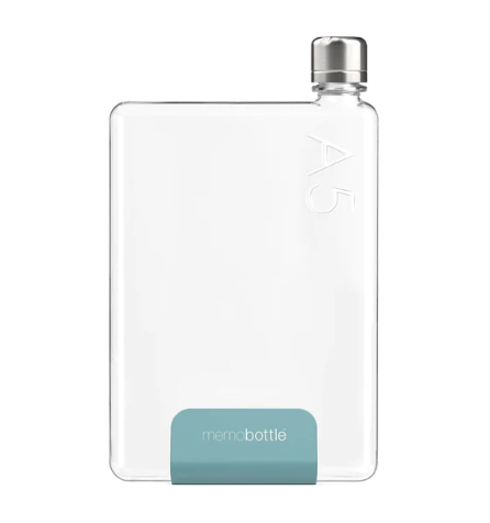 • Garrafa de água transparente formato caderno com tampa prata e etiqueta azul memobottle