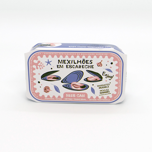 • Lata de mexilhões em escabeche da marca Miss Can com embalagem azul e branca e ilustrações coloridas