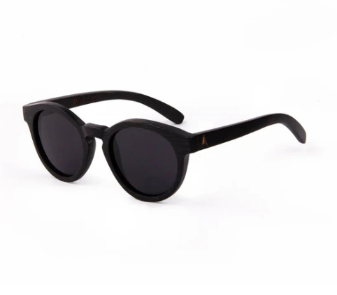 Óculos de sol com armação preta imitando madeira e lentes escuras com fundo azul claro e logotipo Ocean Line