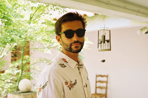 • Homem com óculos de sol redondos pretos e camisa branca com padrão floral
