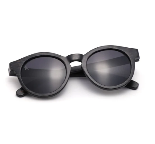 • Óculos de sol com armação preta imitando madeira e lentes escuras com fundo azul claro e logotipo Ocean Line