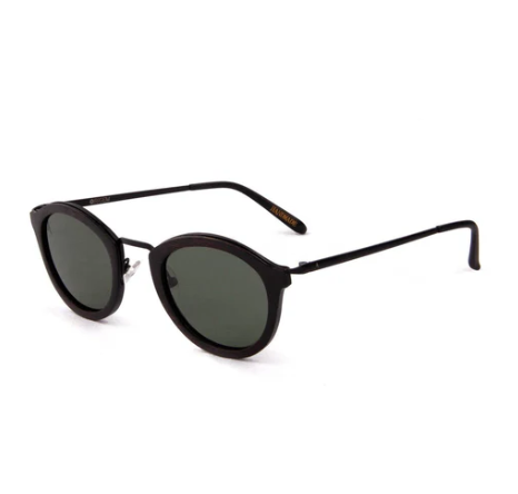 • Óculos de sol redondos com armação preta e lentes escuras.