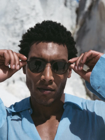• Homem a usar óculos de sol com armação preta e camisa azul