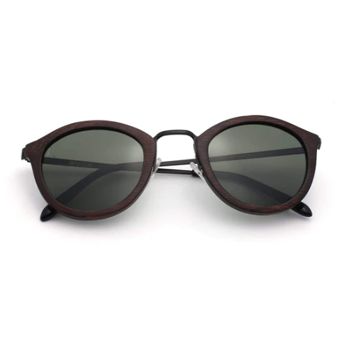• Óculos de sol com armação de madeira escura e lentes escuras