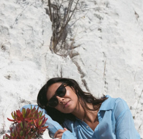 • Mulher com camisa azul clara e óculos de sol pretos encostada em rocha branca junto a plantas