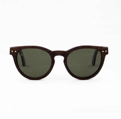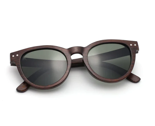• Óculos de sol com armação de madeira escura e lentes verdes escuras