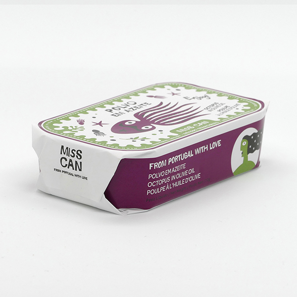 • Lata branca, verde e roxa de polvos em óleo de oliva da marca MISS CAN com ilustração de polvo.