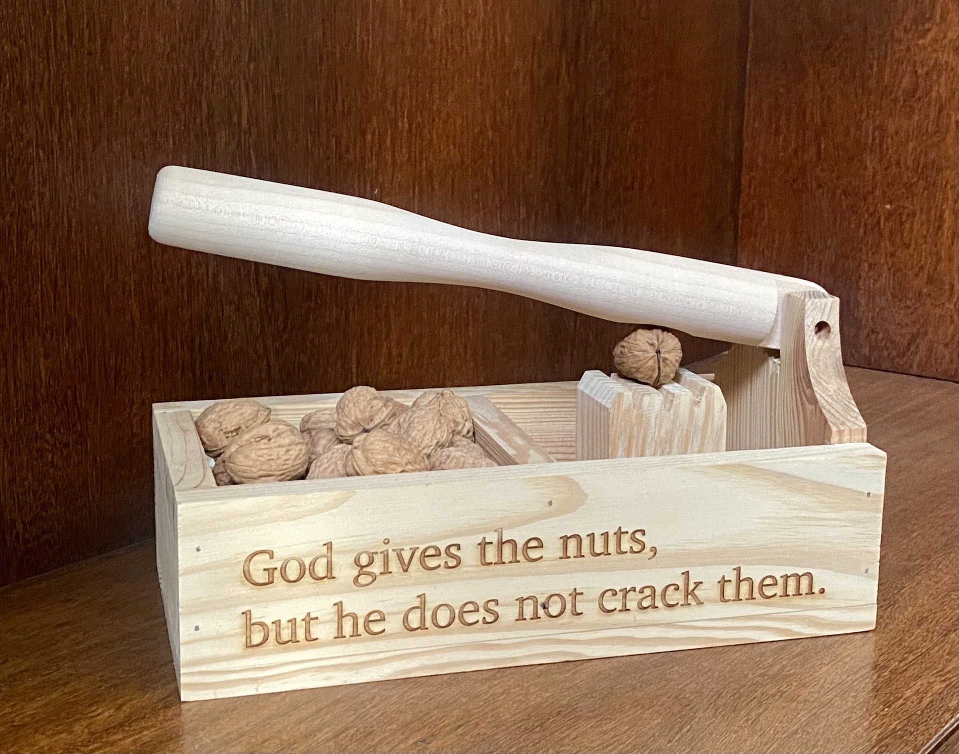 Quebra-nozes em madeira de pinho natural.