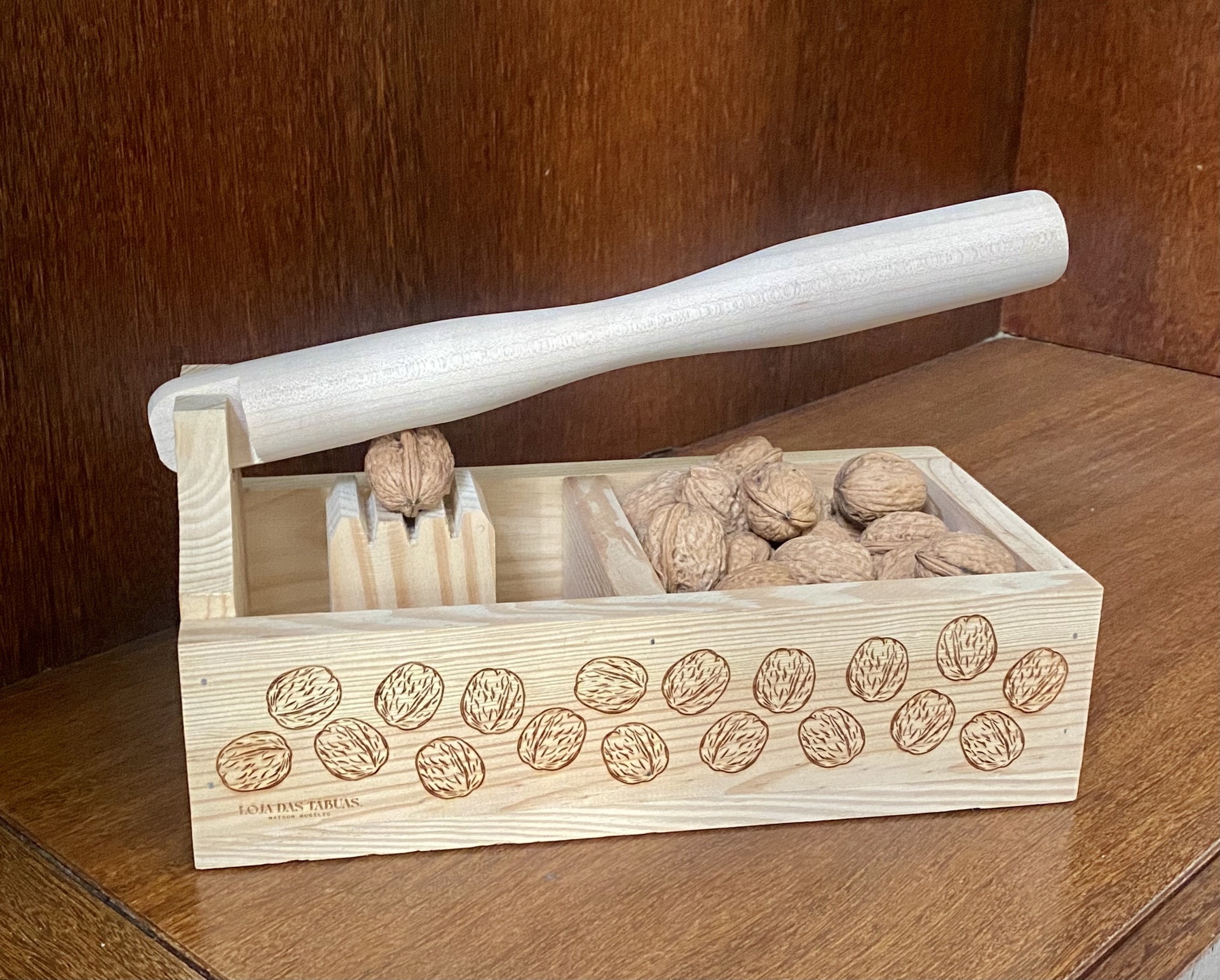 • Descascador de nozes em madeira clara com ilustrações de nozes na lateral