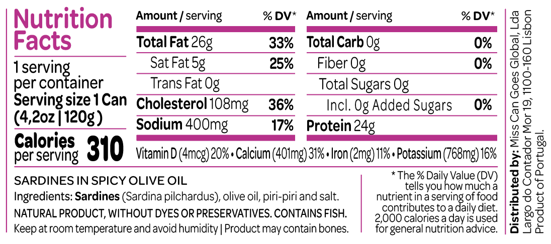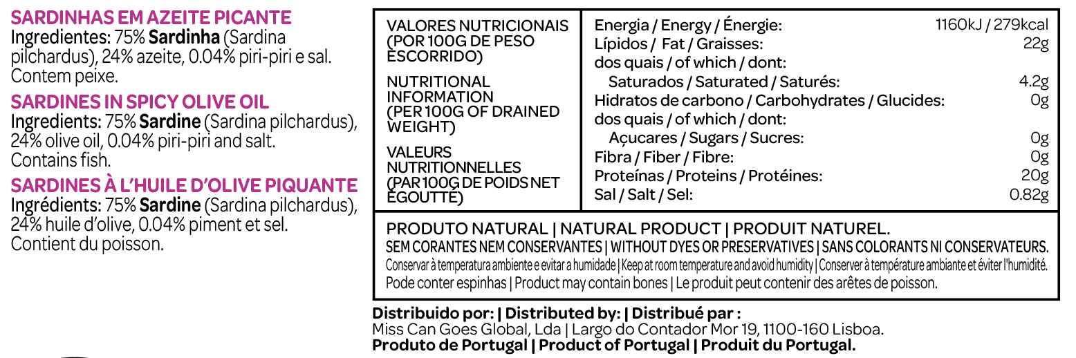 • Embalagem de sardinhas em azeite picante com texto nutricional e ingredientes