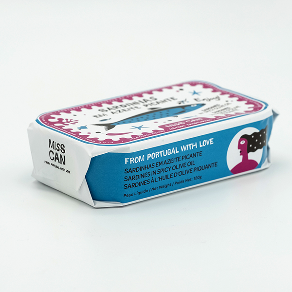 • Lata de sardinhas Miss Can em azeite picante com ilustração de sardinha azul
