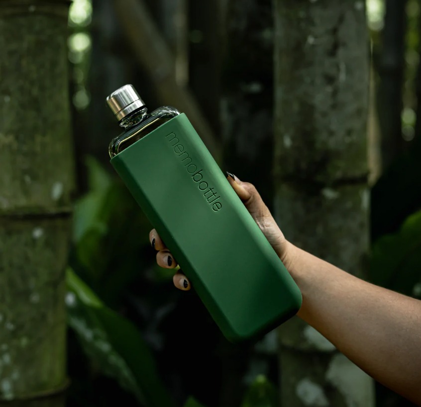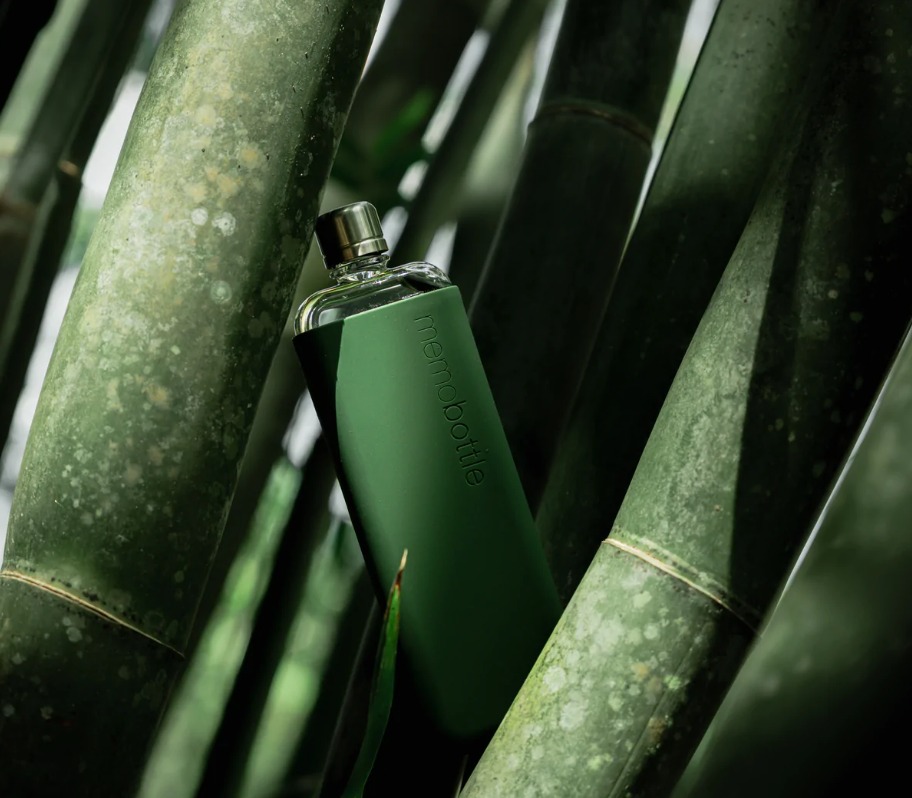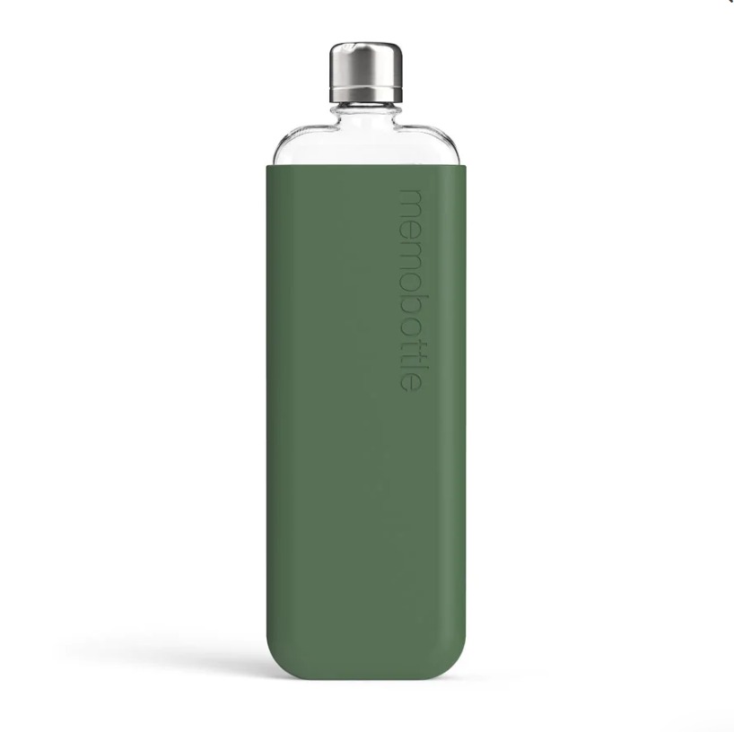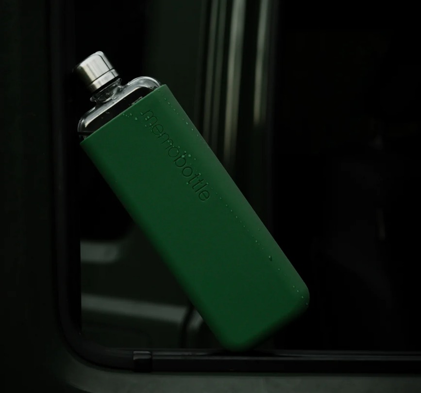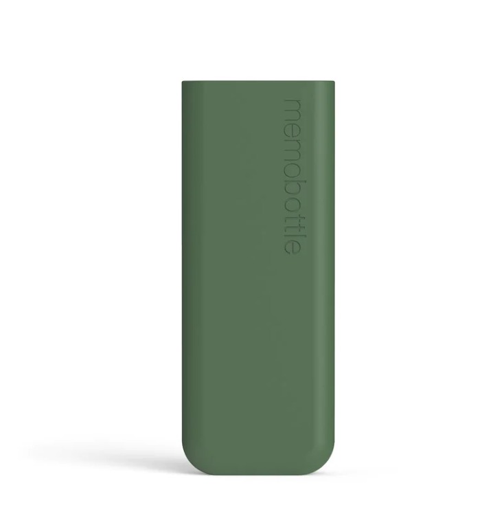 The SLIM Moss Green Silicone Sleeve fits the SLIM memobottle like a glove.