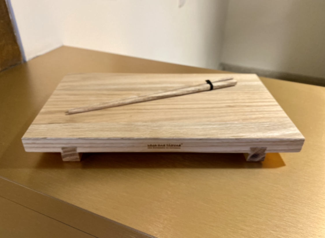 • Tabuleiro de madeira clara com pauzinhos em cima sobre superfície castanha