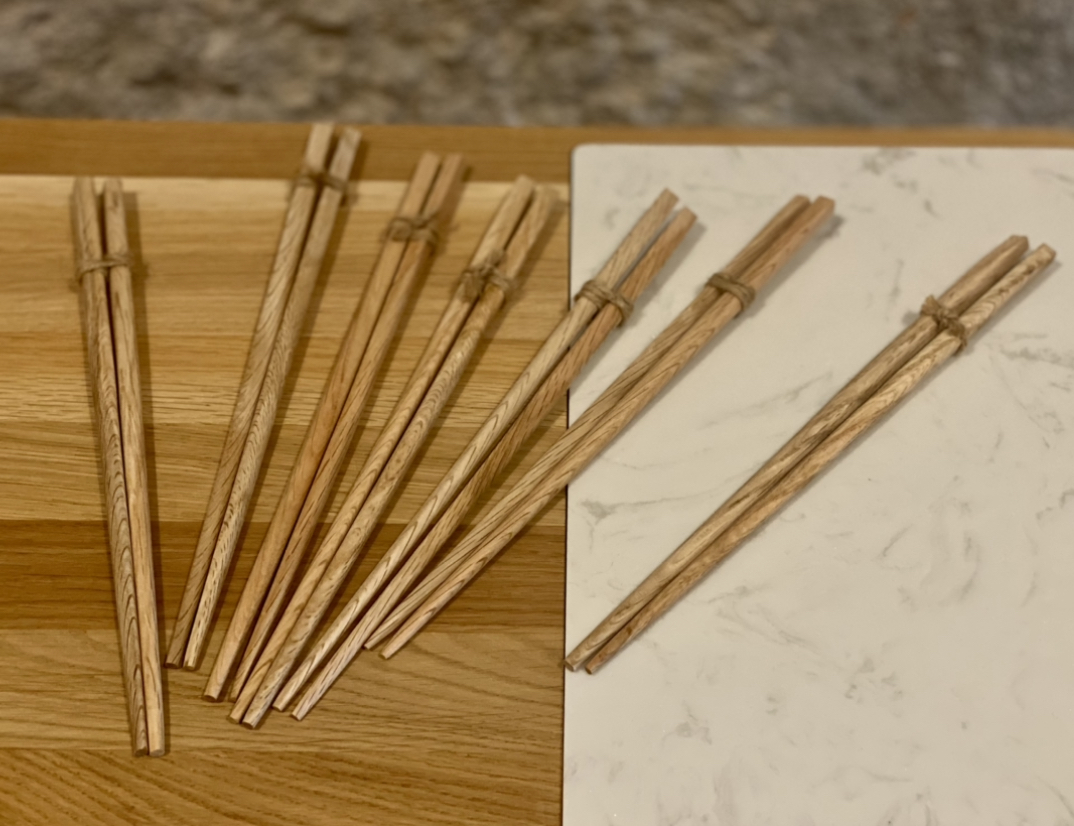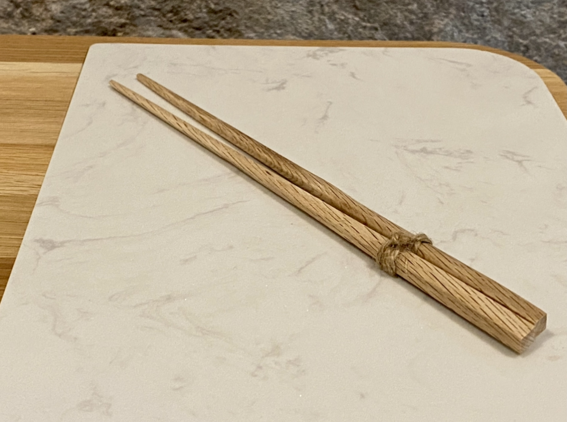 • dez pauzinhos de madeira clara amarrados em pares sobre superfícies de madeira e mármore