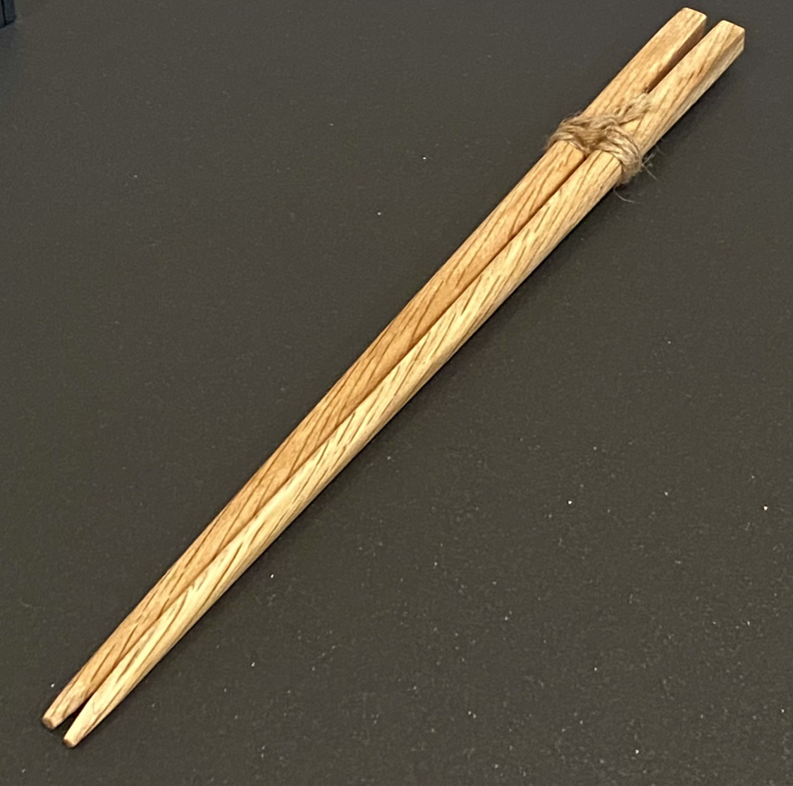 • Pauzinhos de madeira claros amarrados por fio rústico sobre superfície preta