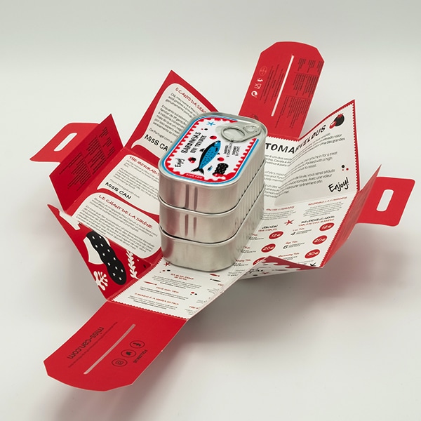 • Embalagem vermelha com três latas de conserve empilhadas com rótulos coloridos