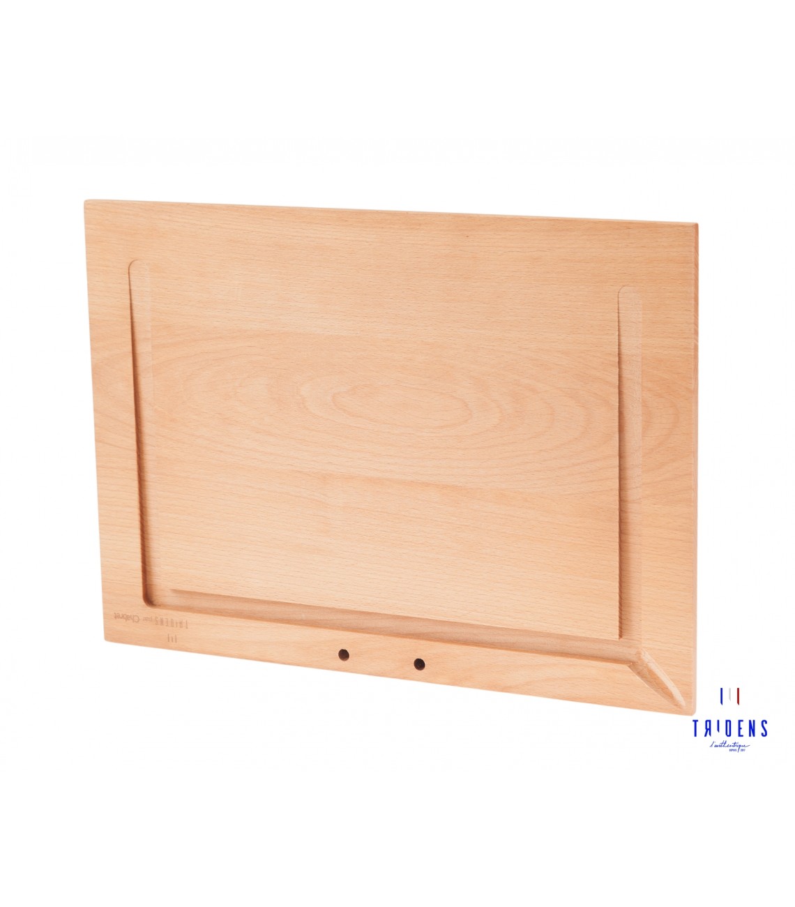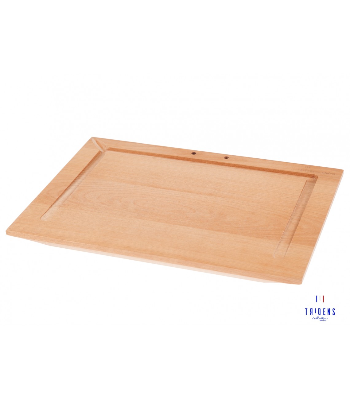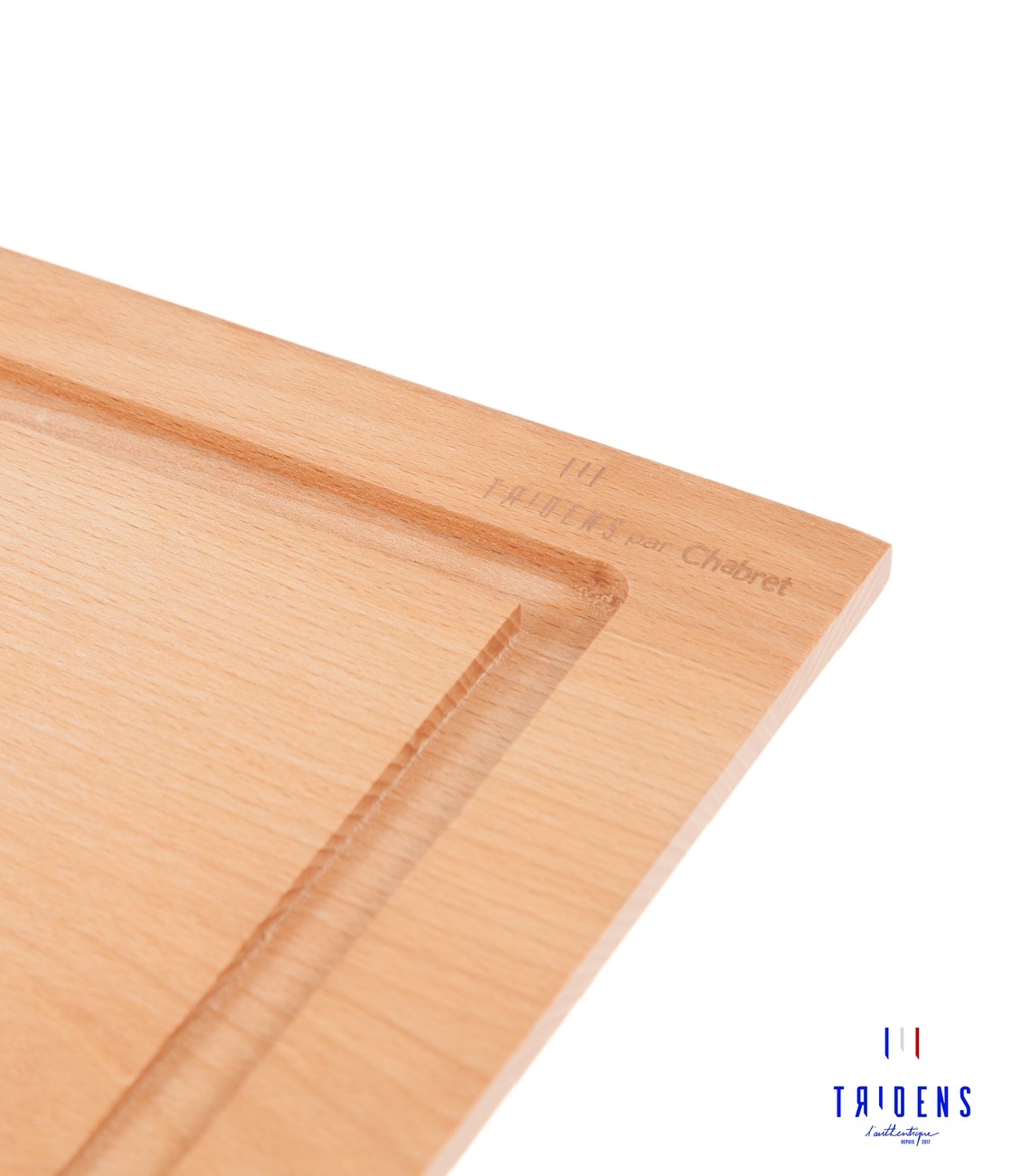 Tridens is proud to present the new professional chopping board. Made in France, this board with an exceptional finish in solid Beech wood meets all the criteria to make you enjoy working in the kitchen. This beautiful professional chopping board makes cutting and presenting meat easy. The wide spout with a pourer on the upper left corner naturally directs the juices to avoid spillage. So, you can continue to enjoy cooking with a clean and dry work surface. The practicality of this exceptional creation never ends. You will also appreciate the handle on the back for easy handling of your tray.