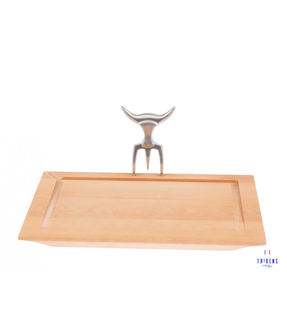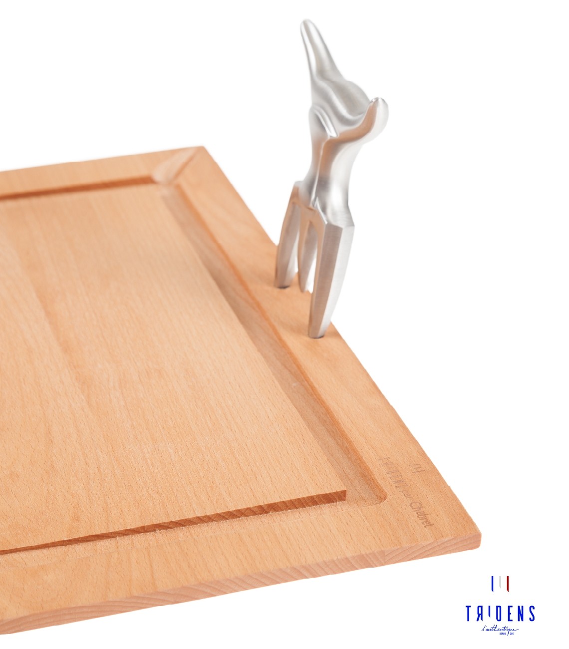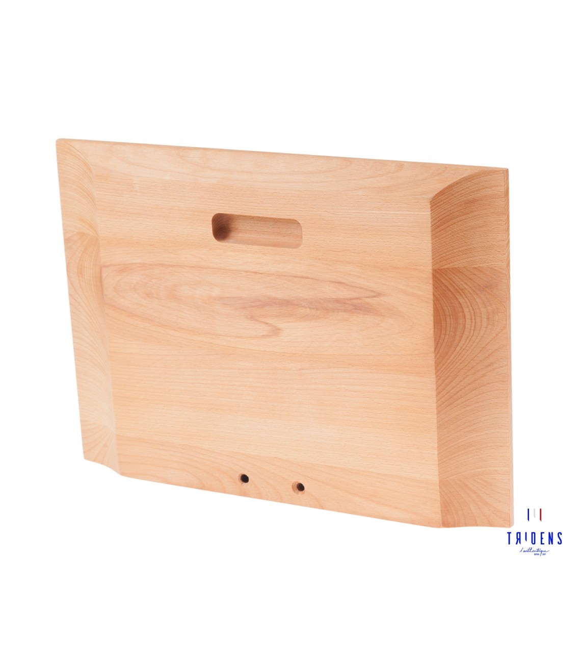 Tridens is proud to present the new professional chopping board. Made in France, this board with an exceptional finish in solid Beech wood meets all the criteria to make you enjoy working in the kitchen. This beautiful professional chopping board makes cutting and presenting meat easy. The wide spout with a pourer on the upper left corner naturally directs the juices to avoid spillage. So, you can continue to enjoy cooking with a clean and dry work surface. The practicality of this exceptional creation never ends. You will also appreciate the handle on the back for easy handling of your tray.