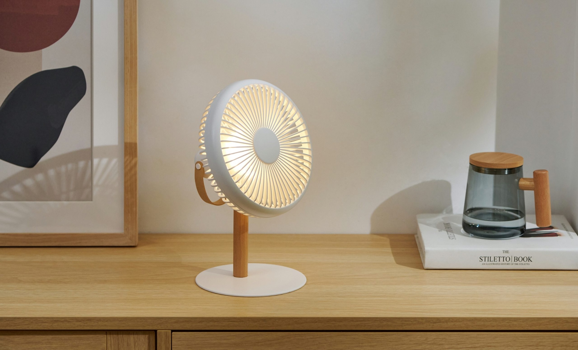 Ventilador Beyond - Com Base de Madeira, 3 Velocidades, Luz Noturna e 12 Horas de Autonomia - Cream White