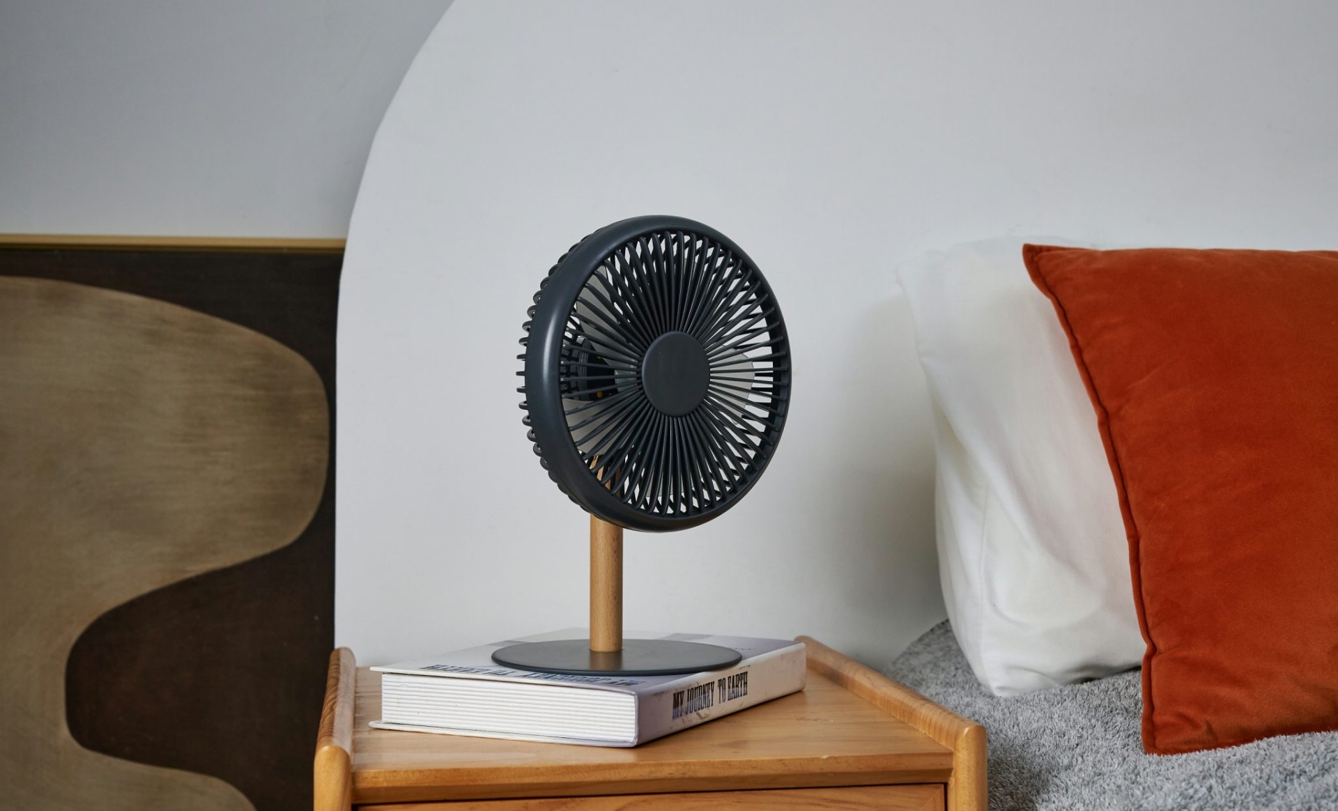Boasting a sleek, modern design with compact craftsmanship, this fan has a flat, round, ultra-thin base and a smart cylinder stand made with sustainable, natural wood. The five-blade design ensures high speed, noiseless operation, and an aesthetically pleasing look in three smooth finishes: smart grey, cream-white or navy green.