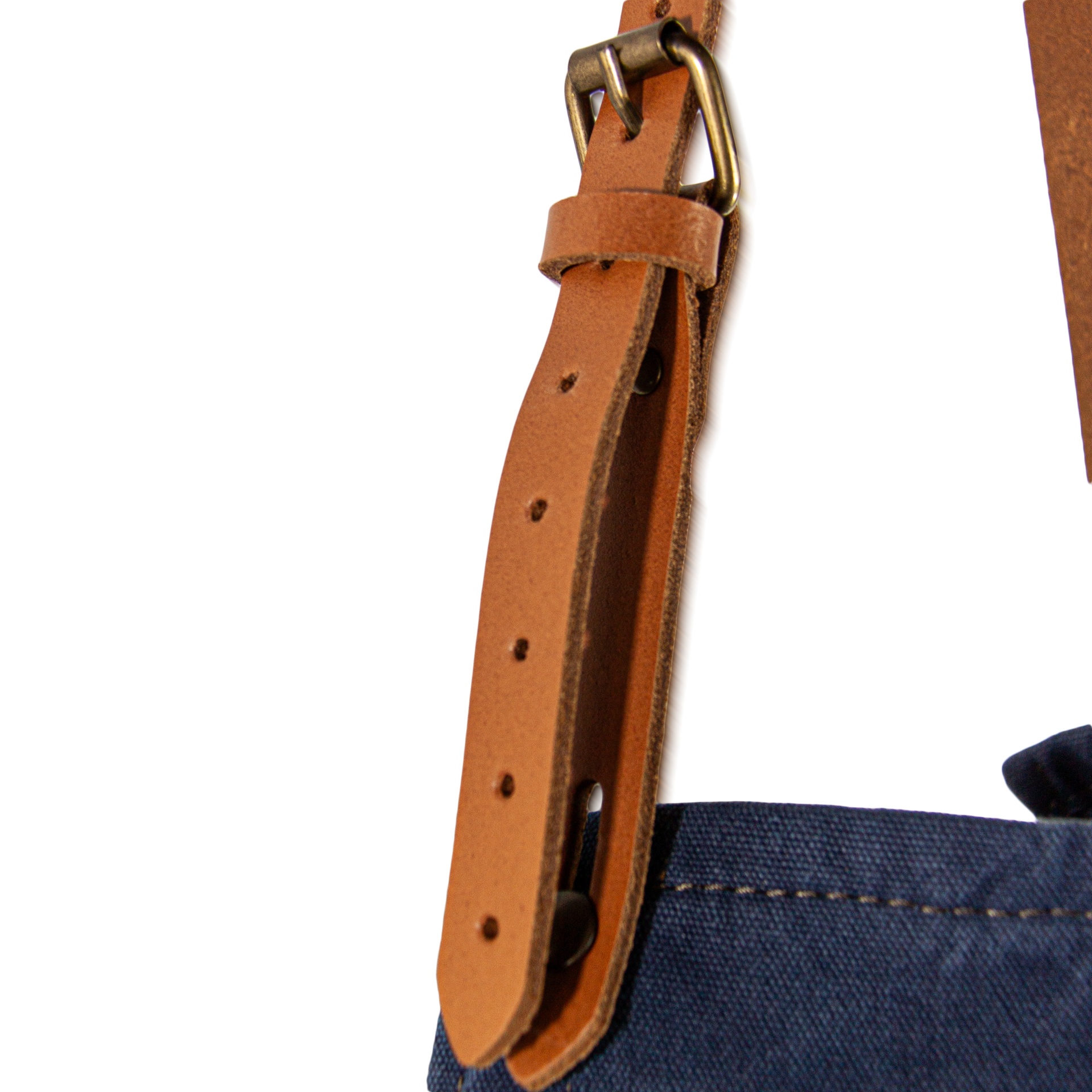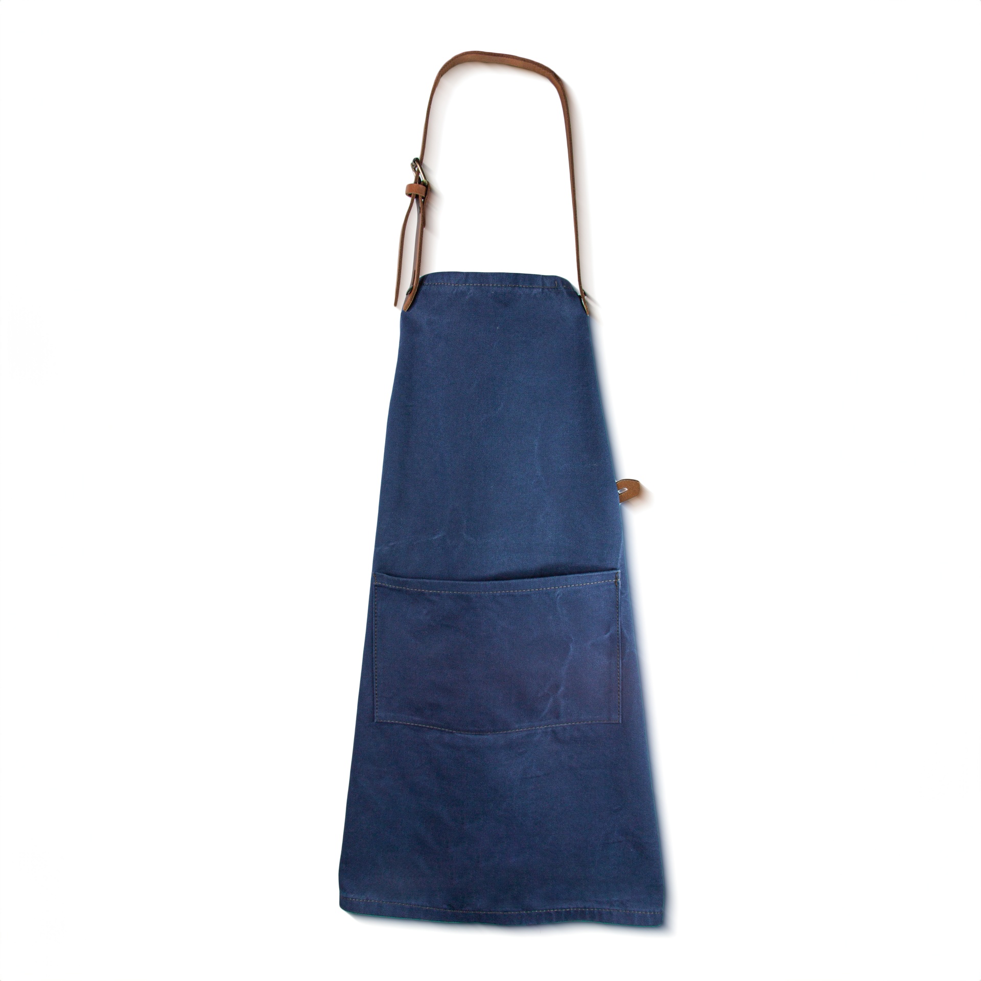 • Avental azul escuro com bolso e alça de pele castanha
